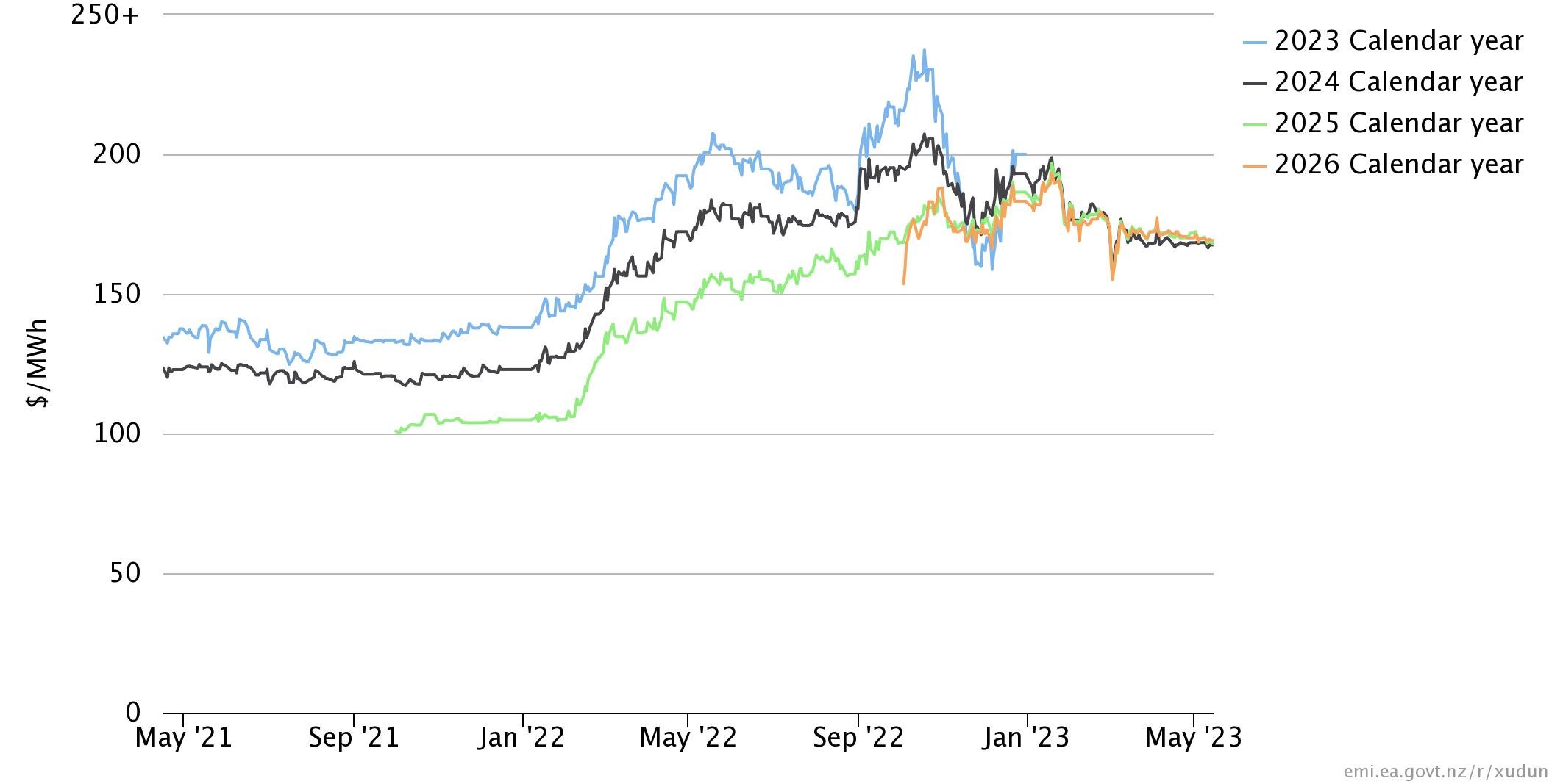 The chart below illustrates the Forward Price Curves as of 15 May 2023 at the Otahuhu node in Auckland for the calendar year 2023 through to the calendar year 2026. These prices are quoted in megawatt-hour (MWh) and must be divided by ten to attain the equivalent kilowatt-hour (kWh) price.